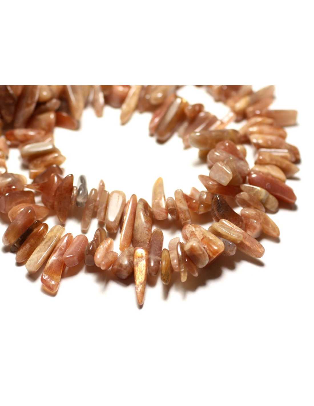 Draad 39cm - Stenen kralen Zonnesteen Natuurlijke halfedelsteen Kleur wit, roze, oranje, met iriserende glitterreflecties Zaadvorm Chips Stokken geboord in de punt Afmetingen Lengte 8-20 mm x Breedte ongeveer 2-5 mm Boorafmeting ongeveer 0,8 mm Verkocht per streng van 39 cm Ongeveer 110 kralen per streng