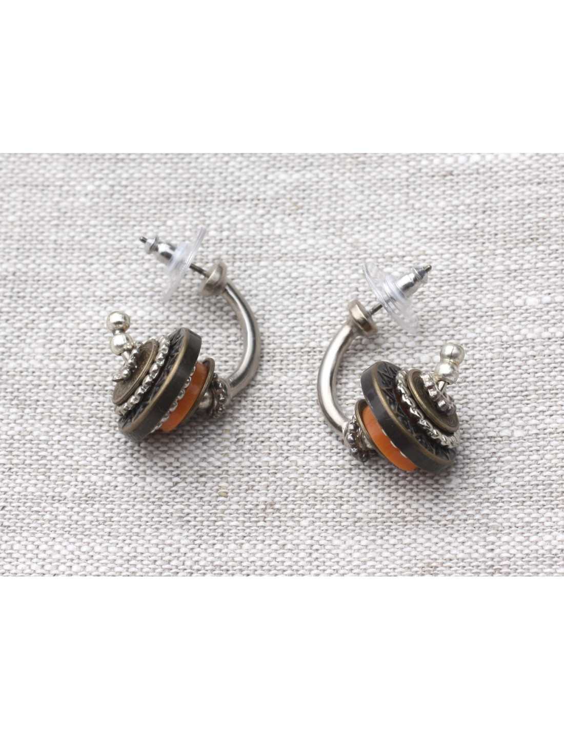 Boucles d'Oreilles Créoles Résine et CCB Orange Bronze Argenté 30mm - Ethnique Vintage designer francais - 8741140025011
