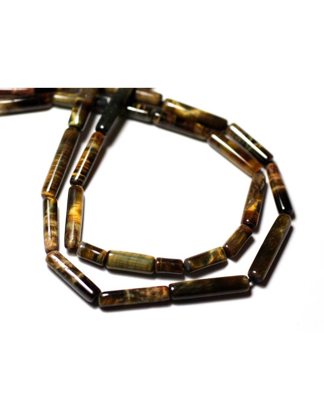 Tijger- en valkoog steen kralen Natuurlijke halfedelsteen Kleur zwart, bruin, brons, goud, blauw, met reflecties Vorm Buizen Afmetingen Lengte 5-13 mm x Dikte 3-4 mm ongeveer Boorafmeting ongeveer 0,3 mm Verkocht door draad van 34 cm Ongeveer 34 kralen per streng