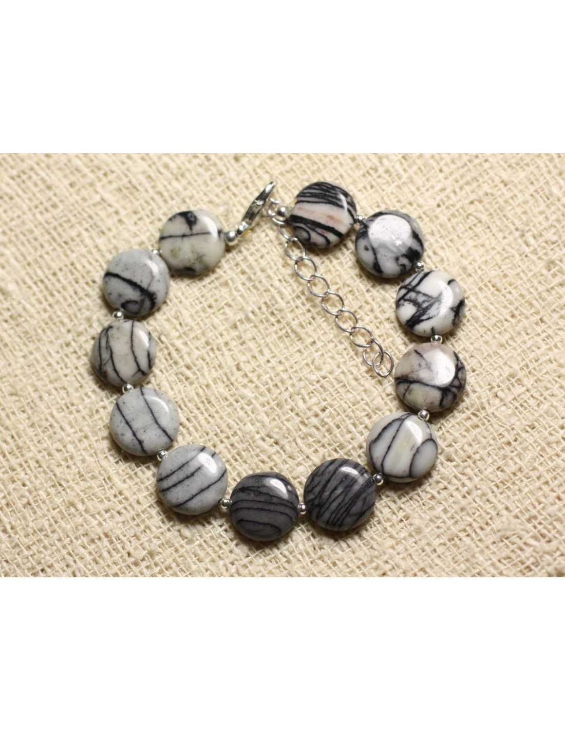 Armband 925 Zilver en Zebra Jaspis Steen Natuurlijke halfedelsteen Kleur wit, grijs, zwart Palet parels ongeveer 12 mm Tussenparels in 925/1000 Zilveren ronde 2 mm Armband gemaakt van sterk en bestendig nylondraad Karabijnsluiting en ketting in 925/1000 zilver Lengte 17 cm + 4 cm zilveren ketting