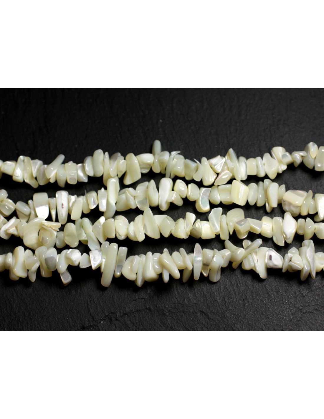 Draad 89cm - Parels Wit parelmoer Natuurlijk parelmoer Kleur wit, iriserend Vorm Rocailles Spaanders Afmeting ca. 5-15mm Boormaat ca. 1mm Verkocht per draad van 89cm Ongeveer 250 kralen per draad