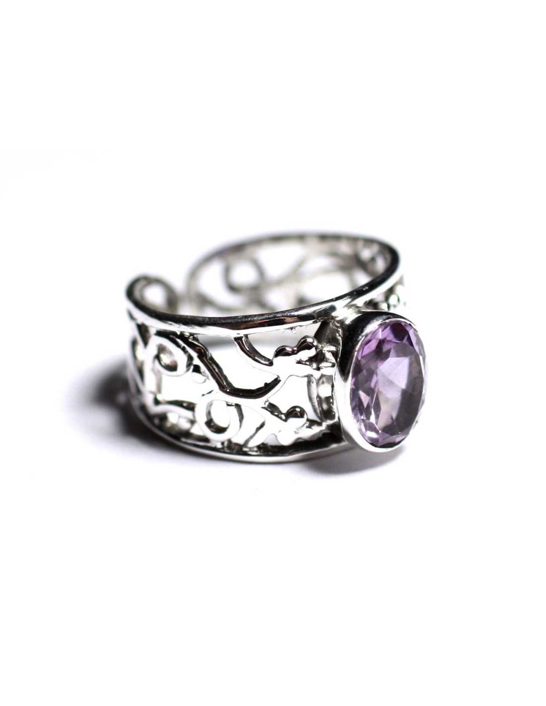 Ring 925 Zilver en halfedelsteen Amethist Facet Ovaal 9x7mm Natuurlijke halfedelsteen Mauve kleur, transparant Ovaal facet geslepen Afmeting Lengte 9mm x Breedte 7mm ongeveer Steen gezet in 925/1000 Zilver Grote ring met arabesk patroon, filigraan Breedte 5 tot 11 mm ongeveer Verstelbare maat minimaal 53