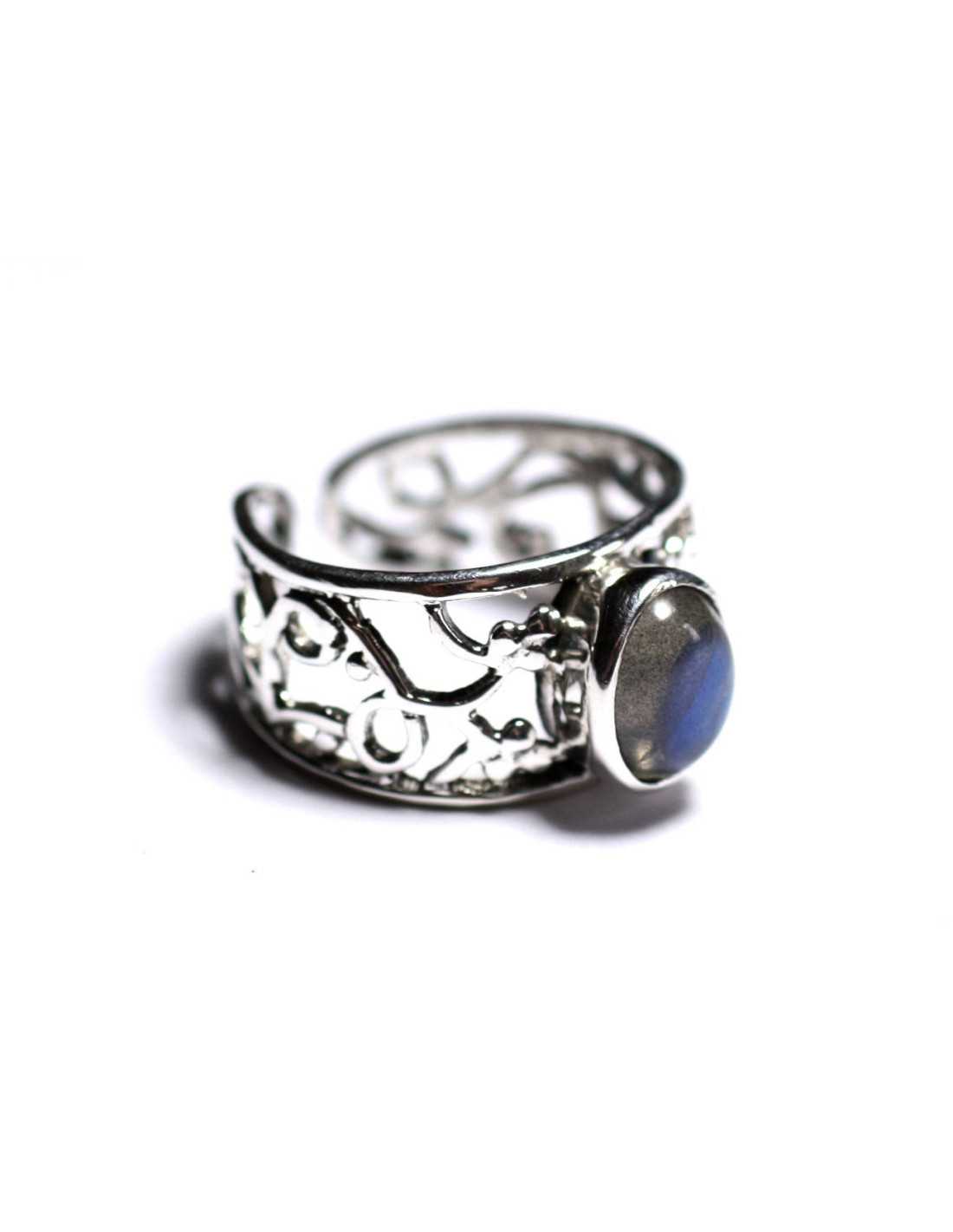 Ring Zilver 925 en halfedelsteen Labradoriet Natuurlijke halfedelsteen Transparant grijze kleur met blauwe reflecties Ovale vorm Afmeting 9x7mm ongeveer Gegarandeerd 925/1000 zilver frame Grote ring met arabesk patroon, filigraan Breedte 5 tot 11 mm Minimaal verstelbare maat 53