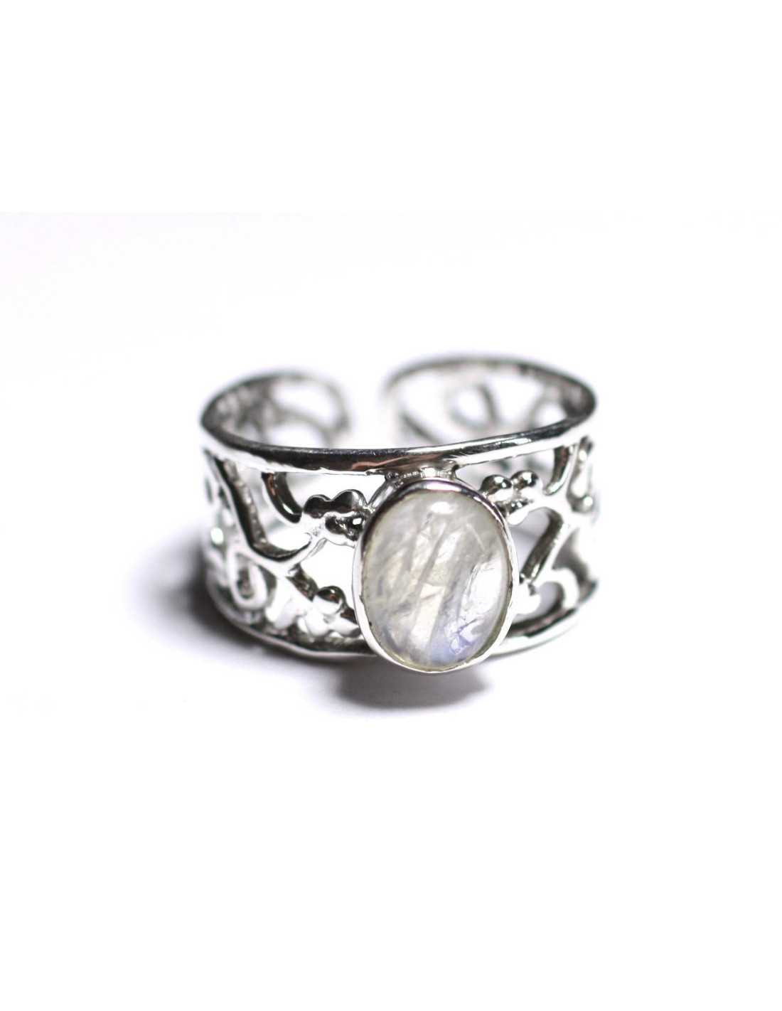 Ring Zilver 925 en halfedelsteen Regenboogmaansteen Natuurlijke halfedelsteen Transparant witte kleur met blauwe reflecties Ovale vorm Afmeting 9x7mm ongeveer Steen gezet in 925/1000 zilver Grote ring met arabesk patroon, filigraan Breedte 5 tot 11 mm Minimaal verstelbare maat 53